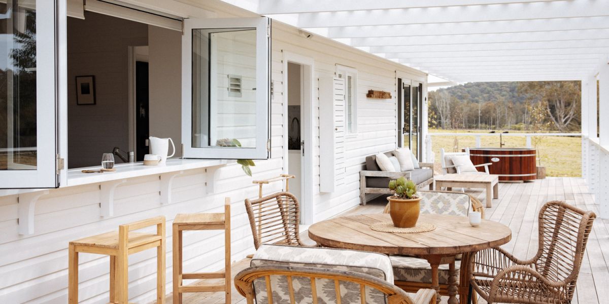 Luxurious in design from the inside out, the country house aesthetic seamlessly blends into the natural surroundings. Shown through the fully equipped kitchen that flows out to the wraparound deck, guests can enjoy breakfast or an alfresco lunch while looking out at panoramic views of the untouched wetlands, spotting a kangaroo or two. Further encouraging a nature-filled experience, an indulgent outdoor bath is at your disposal, as well as a firepit that acts as a central meeting spot for conversations as the day turns to dusk.